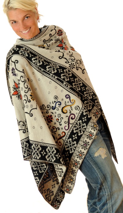 Dieser im Jacquardstrick gefertigte Alpaka-Poncho ist die elegante Alternative zur Jacke. Ein Farbspiel von Cremeweiß und Nachtschwarz prägen diesen mit bunten Blumenranken bestickten Poncho. Dieses in den Anden traditionelle Kleidungsstück kann als Umhang offen oder mit einem Gürtel geschlossen beidseitig getragen werden. Maßtabelle DOB (siehe "Service/Hilfe" Maßtabellen)